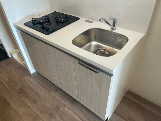 キッチンはシステムキッチンで、2口ガスコンロを完備。自炊派の方でも調理しやすく、毎日の食事作りがスムーズに行えます。コンパクトながらシンクの広さも十分。機能性の高い仕様です。