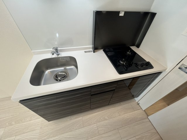 2口ガスコンロ付きのシステムキッチンは、調理効率を重視する方に嬉しい設備。作業スペースも確保されており、日常の自炊からちょっとした料理まで快適に対応できます。