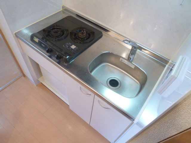 キッチンは2口ガスコンロ付きのシステムキッチン。コンパクトながら調理スペースが確保されており、外食と自炊を上手に使い分けたい方にもおすすめです。