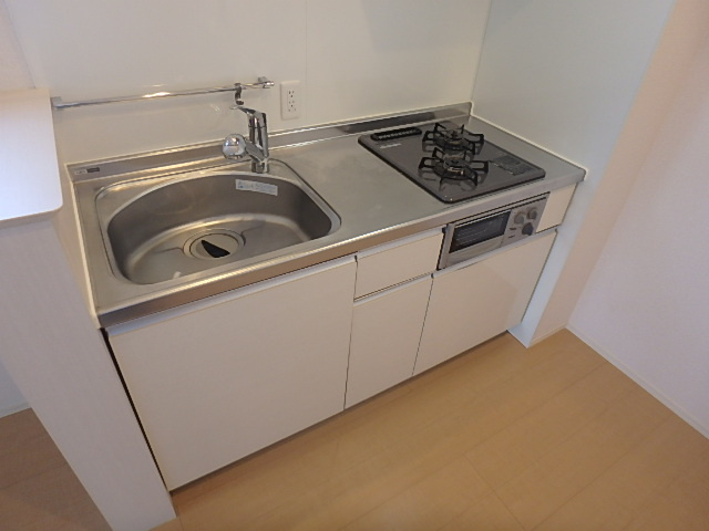 キッチンは2口ガスコンロ・グリル付きのシステムキッチンを採用。さらにカウンターキッチンのため、調理中も空間に開放感があります。ちなみに、同時調理がしやすく、日々の自炊が効率よく進みます。