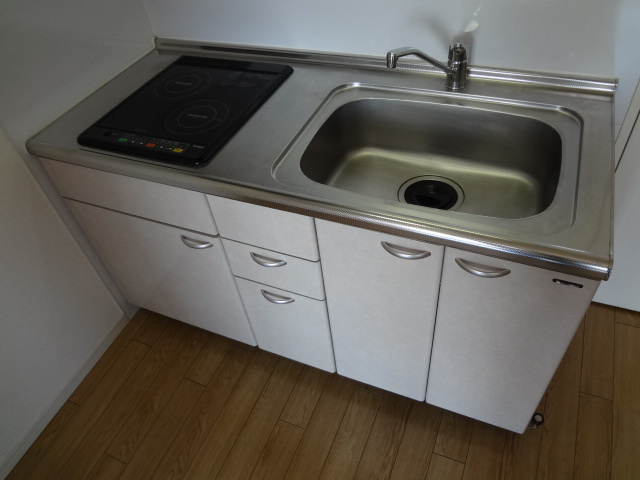 キッチンはIH2口コンロ付きのシステムキッチン。同時調理がしやすく、自炊派の方にも嬉しい仕様です。加えて、オール電化のため火を使わず安全性にも配慮されています。