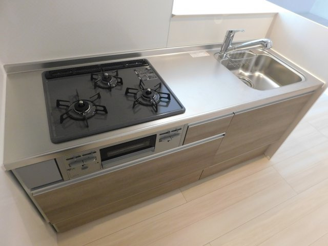 3口コンロのシステムキッチンに加えカウンターキッチン仕様のため、料理をしながら会話を楽しめるのもポイントです。また、都市ガス仕様でランニングコストを抑えやすく、自炊派の方にも嬉しい設備が整っています。