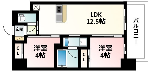 間取りは2LDKで、LDK12.5帖に洋室4帖が2部屋という構成のため、二人暮らしや在宅ワーク用の個室を確保したい方にもおすすめです。そのため限られた面積ながら、生活動線を意識した間取りとなっています。