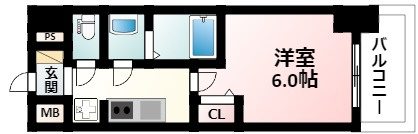 間取りは1Kで、洋室6帖とキッチン2帖のシンプルな構成となっています。そのため家具配置がしやすく、初めての一人暮らしや住み替えにも取り入れやすい間取りです。