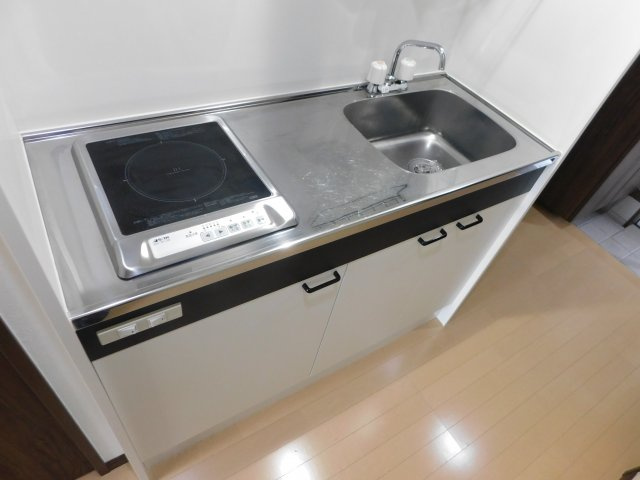 キッチンにはIH1口コンロ付きのシステムキッチンを採用しており、火を使わず安心して調理が可能です。さらに、コンパクトながら作業スペースも確保されているため、自炊派の方にも向いています。