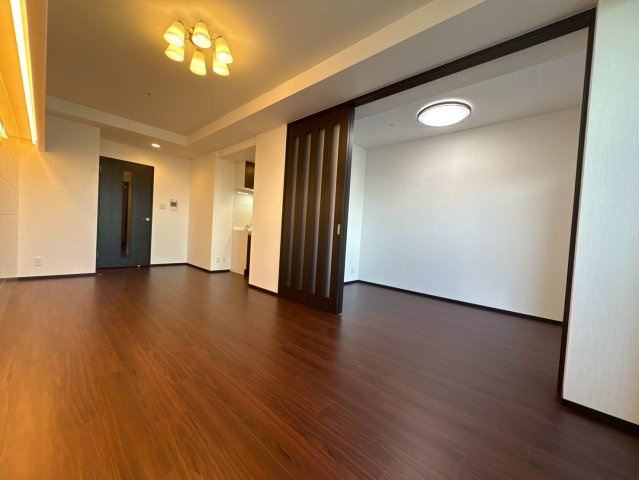 東向きバルコニーに面したLDKは、朝の光が入りやすく一日のスタートを気持ちよく迎えられる空間です。また、フローリング仕様で家具配置もしやすく、シンプルながら上質さを感じられる室内となっています。
