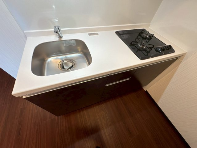 2口ガスコンロ付きのシステムキッチンを採用しており、日常的に料理をされる方にも使いやすい仕様です。さらに、作業スペースも確保されているため、無理なく自炊を続けられる点も魅力です。
