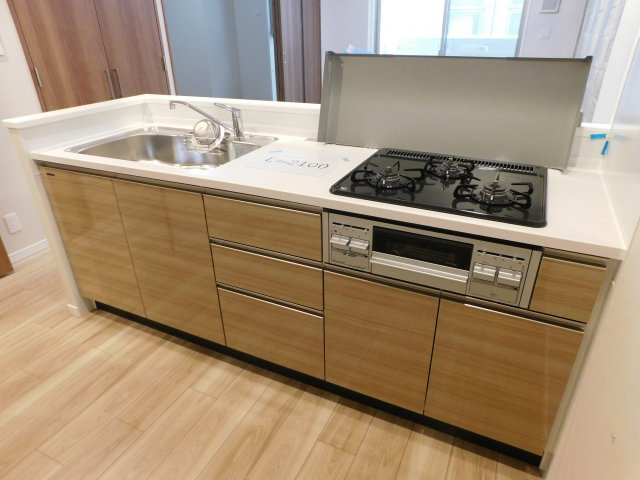 システムキッチンは3口ガスコンロ仕様で、効率良く調理が可能です。またカウンターキッチンとなっているため、リビングとの一体感があり、会話を楽しみながら料理ができます。